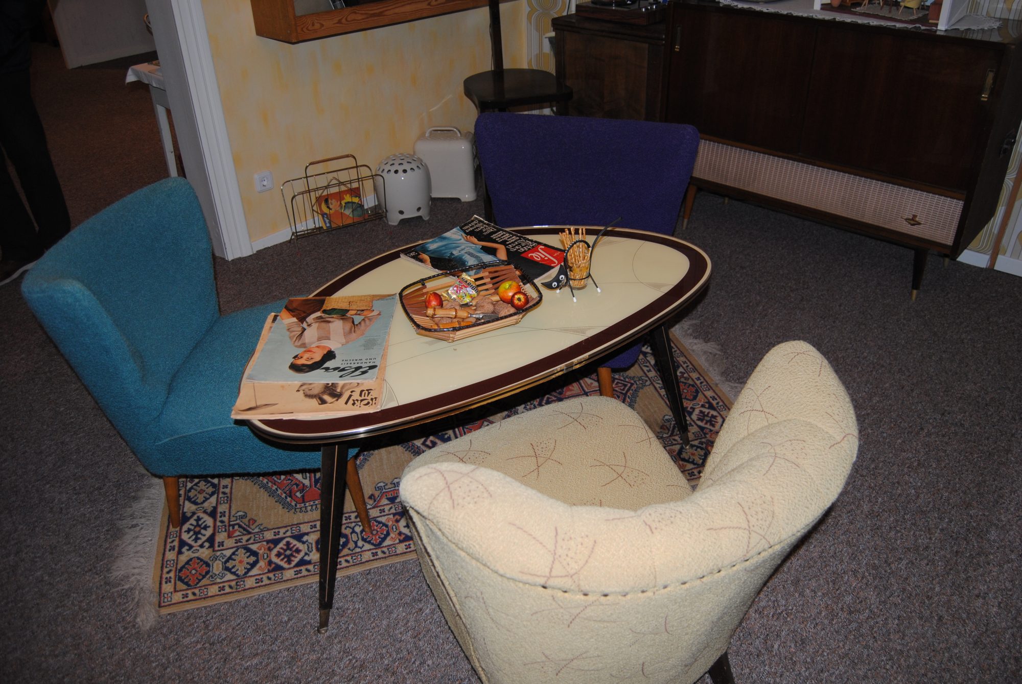 Aber zurück zum Heimatmuseum und das heißt in diesem Fall „Back to the 50’s“! Das war nämlich das Motto im Nebenzimmer. Dort gab es ein Wohnzimmer im Stil der 50er eingerichtet, natürlich original mit Nierentischen Tulpenstehlampen. Was natürlich auch auf gar keinen Fall fehlen durfte, waren bunte Cocktailsessel. Kaum zu glauben das sich damals jeder um so einen Sessel gerissen hat! Wobei ich persönlich finde die Dinger eigentlich ganz cool!