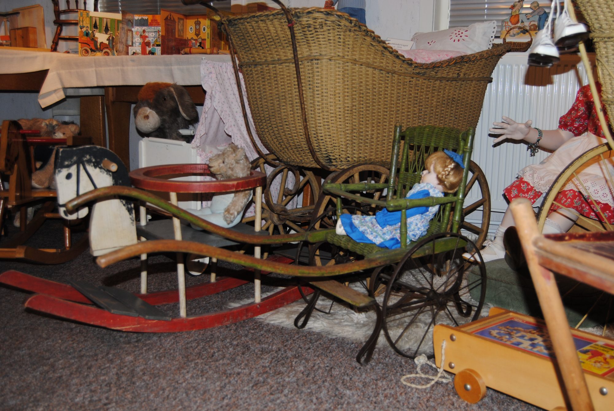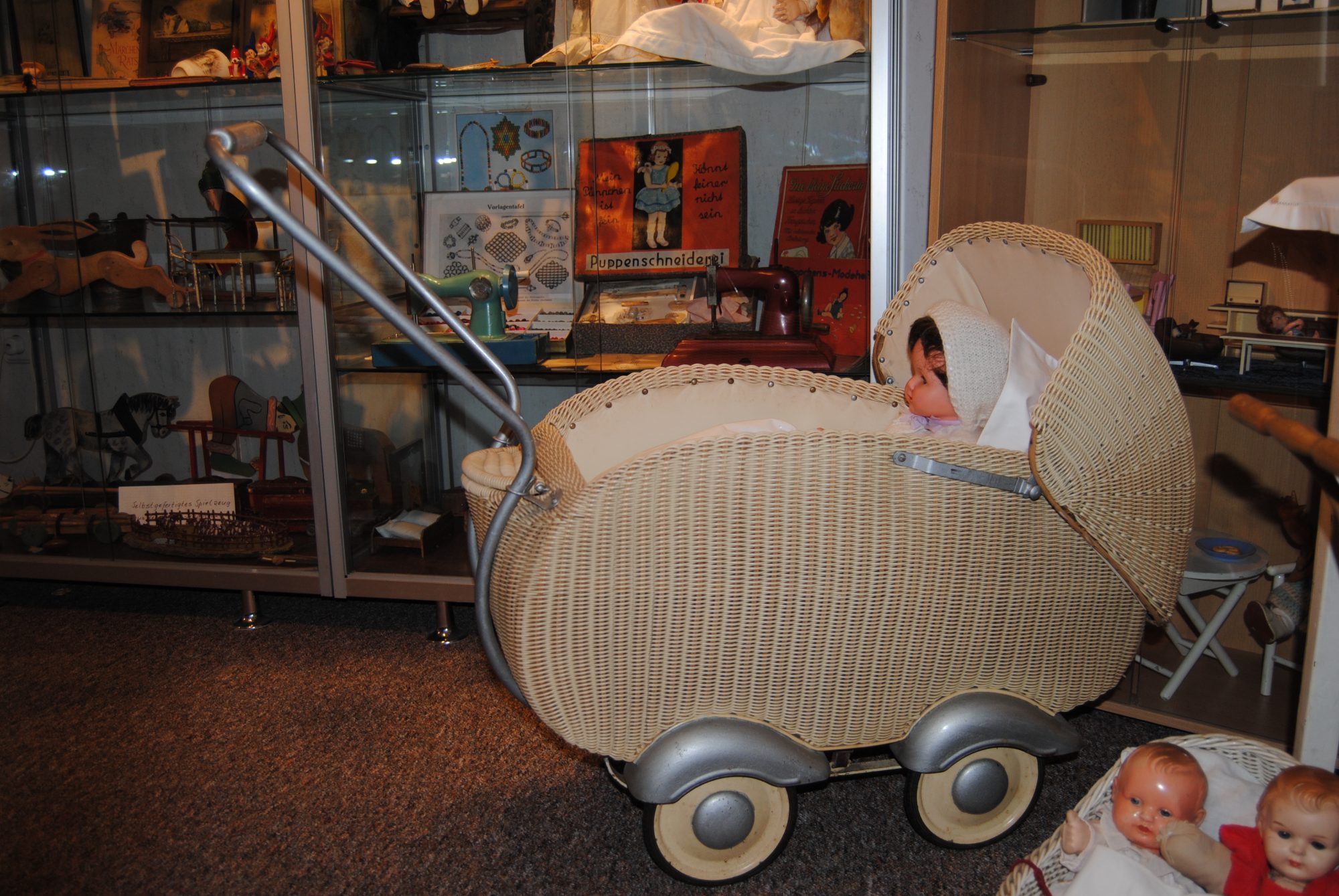 Nebenan ging’s weiter mit unzähligen alten Spielsachen. Von Kaufmannsläden über Puppenwagen bis hin zu „Kinder-Rikschas“. Ich hab das Gefühl, dass die Kinder damals sehr viel mehr Fantasie brauchten, zumindest wenn es ums Spielen ging. Auch die Materialien der Spielsachen waren ganz andere im Vergleich zu denen in der heutigen Zeit. Vieles wurde aus Blech, Holz oder sogar Pappe gefertigt. Wenn ich da so an mein Polly-Pocket-Traumschloss aus Plastik denke, muss ich schon wieder schmunzeln. Als ich das gesehen habe, musste ich zugeben, auch wenn es mir irgendwie nicht gefällt (Wahrscheinlich weil ich selber dazu zähle), dass die Kinder von heute ganz schön verwöhnt werden im Gegensatz zu früher…